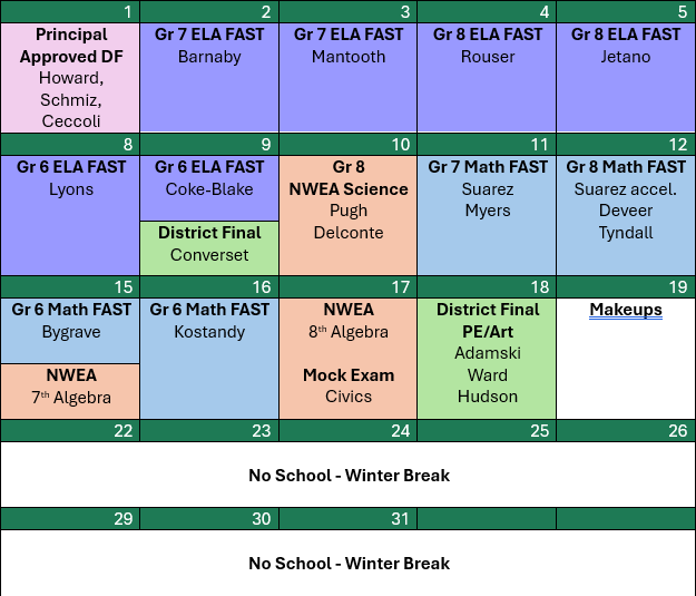Students will be FAST testing on the dates of their assigned ELA and Mathematics Teachers. Students will also be taking the NWEA Science and Algebra, and Mock Civics tests. Please Click here to review the Calendar for December
